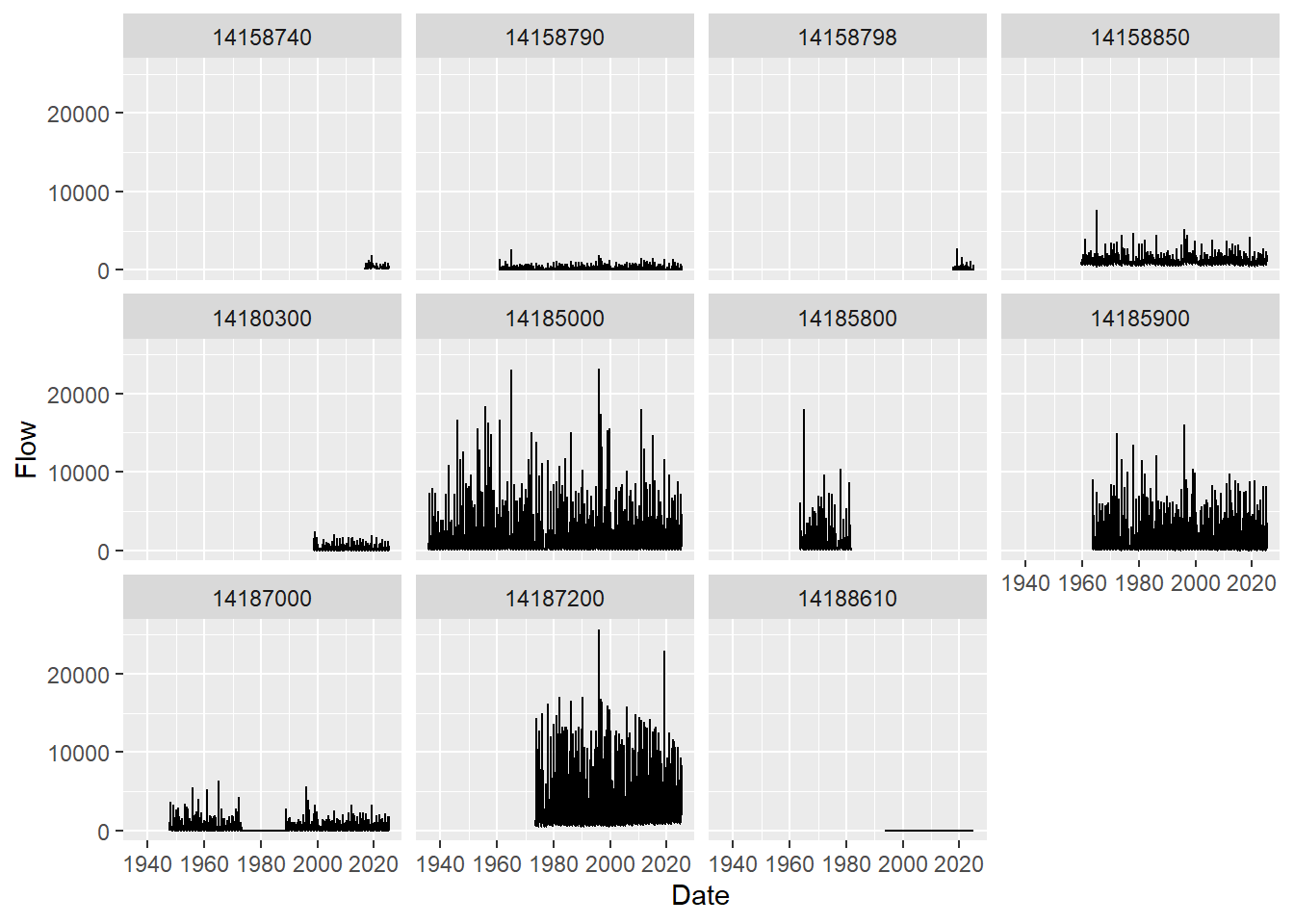 It looks like only 5 of our nwis sites had flow data for which we’ve plotted streamflow information for all the years available.