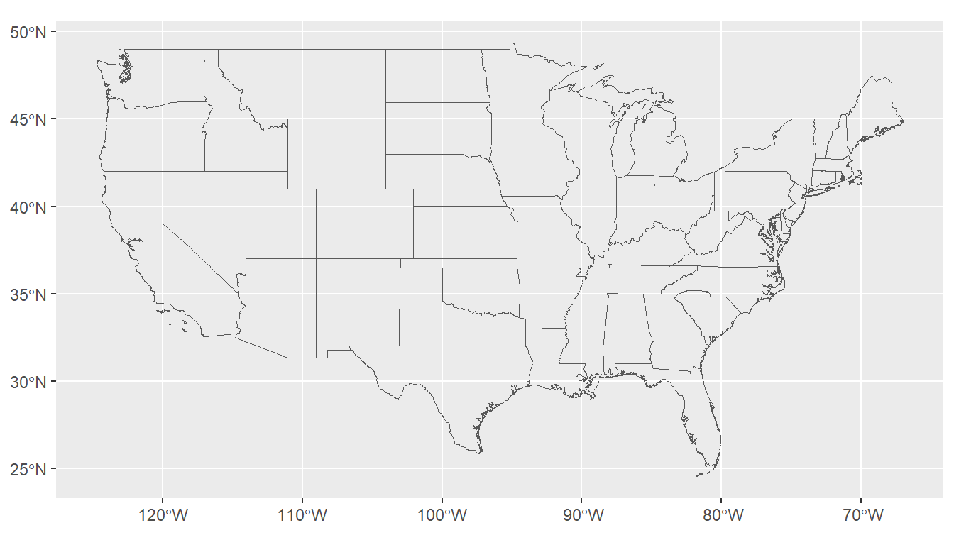 Below is an example of pulling in US states using the rnaturalearth package - note that the default is to pull in data as sp objects and we coerce to sf. Also take a look at the chained operation using dplyr. Try changing the filter or a parameter in ggplot.